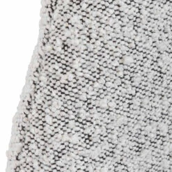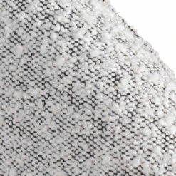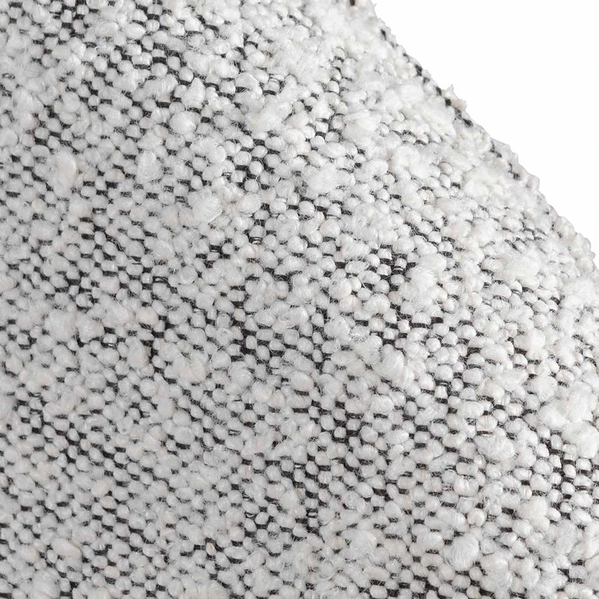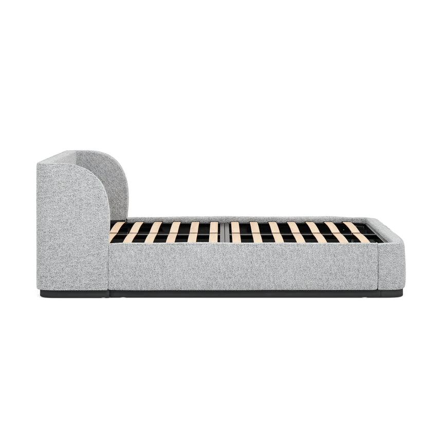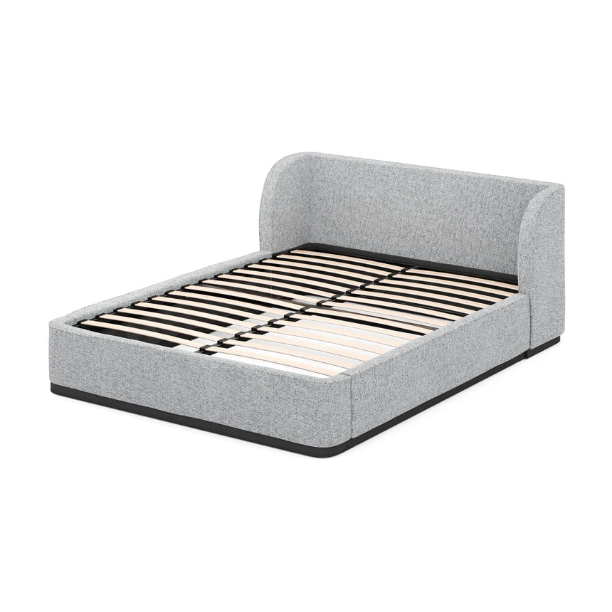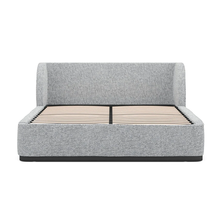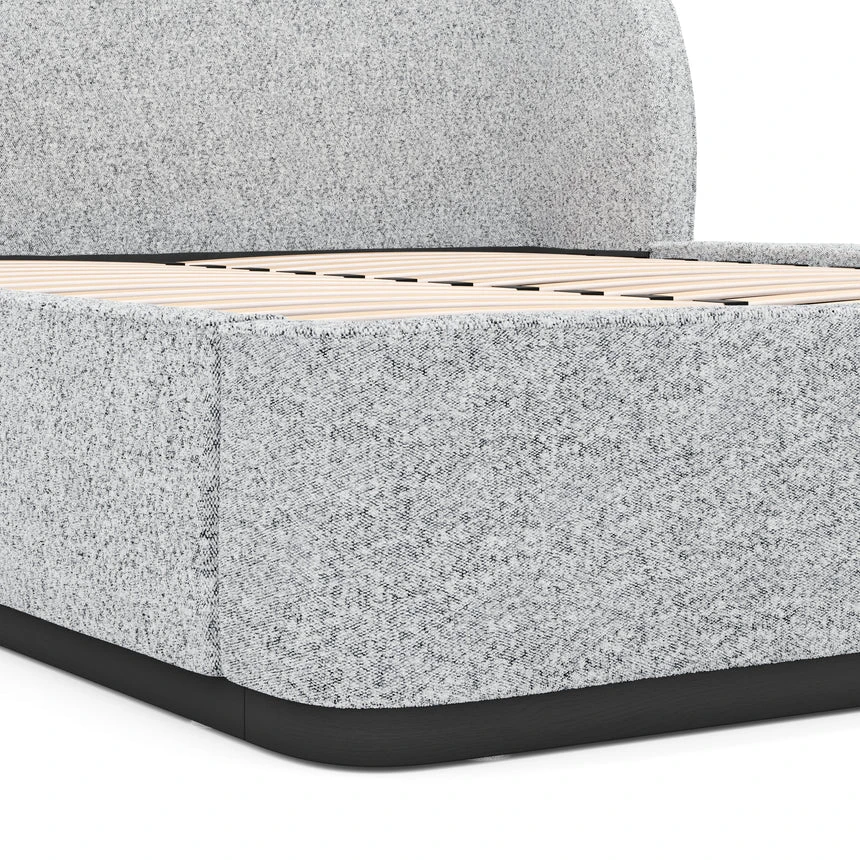 Durable pepper boucle fabric upholstery Fabric in a 80% polyester and 20% acrylic blend Strong hardwood frame and included slats frame Solid wood base in black stain Headboard in curved and wingback silhouette Accommodates a standard queen size mattress Product is flat packed and requires two-man assembly Bed slat comes pre-assembled Note: This product is not on display in our showrooms.