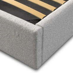 Clay grey polyester upholstery Timber, solid wood, and P5 plywood construction Medium-firm Foam filling Gas lift mechanism supports up to 50 kg Rubber legs Wide base design Fits standard queen-sized mattresses Weight capacity: 300 kg Two-person assembly required Notes: Bed mattress not included