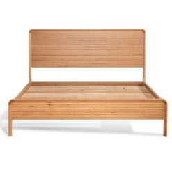 Messmate wood construction with a complete natural finish Deep wood grains prevalent throughout adds depth and texture Head and foot-board in solid wood with a slatted design Side rails in a contrasting smooth finish Compact square legs for subtle height suspension Clean profile with precise curved top edges Accommodates a queen 153cm x 203cm mattress Available for commercial use 1-year warranty Product is flat packed and requires two-person assembly Bed slat comes pre-assembled Notes: King size pictured Each piece will have its own unique imperfections and markings due to the nature of the wood Bed head is positioned significantly above slats to offer ample spacing between bedhead and mattress for a transparent appearance