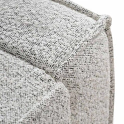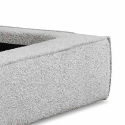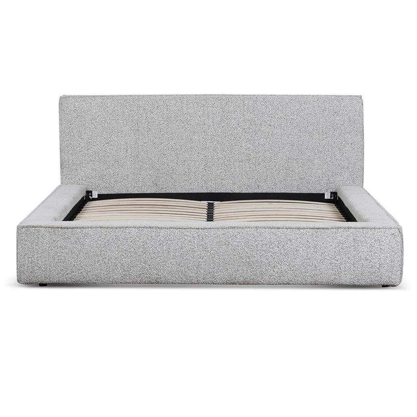 Upholstered in a Pepper boucle fabric Constructed in engineered wood K/D slats and central steel frame Well-padded low and rectangular frame Inverted seaming details along edges Accommodates a queen 153cm x 203cm mattress Product is flat packed and requires two-person assembly