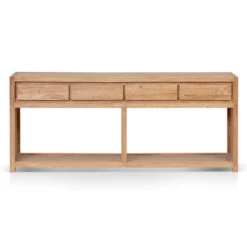Durable elm wood and veneer construction Deep wood textures and patterns throughout Rustic texture and linear form Mid-section fitted with an open design 4x drawers on metal rails Available for commercial use Product comes fully assembled Notes: Each piece will have its own unique imperfections and markings due to the nature of the wood. Any variations of wood grain and colour are not inconsistencies and should be appreciated Dust using a soft and dry cloth. Wipe up spills immediately. Wash with mild dish soap and water solution