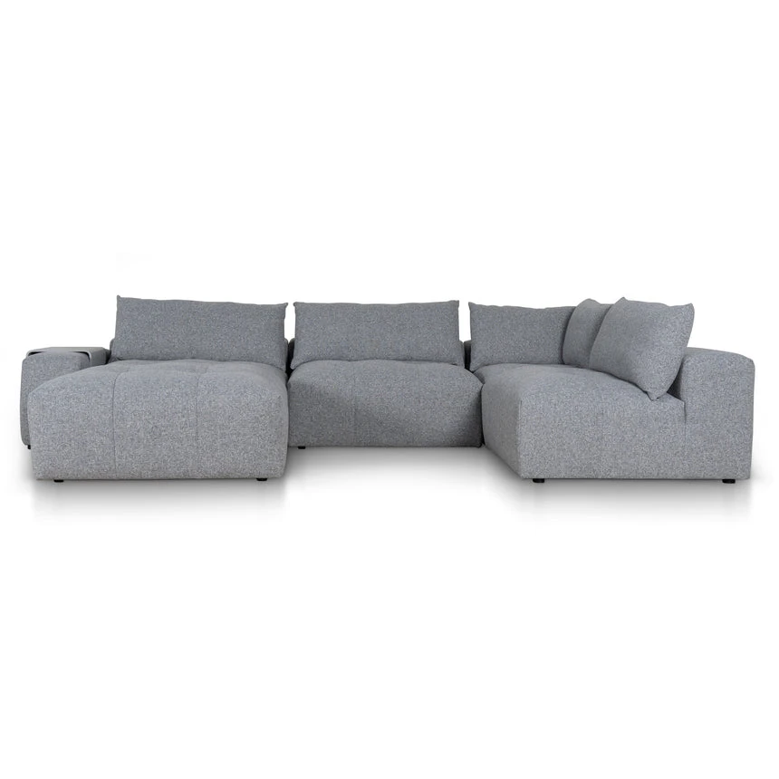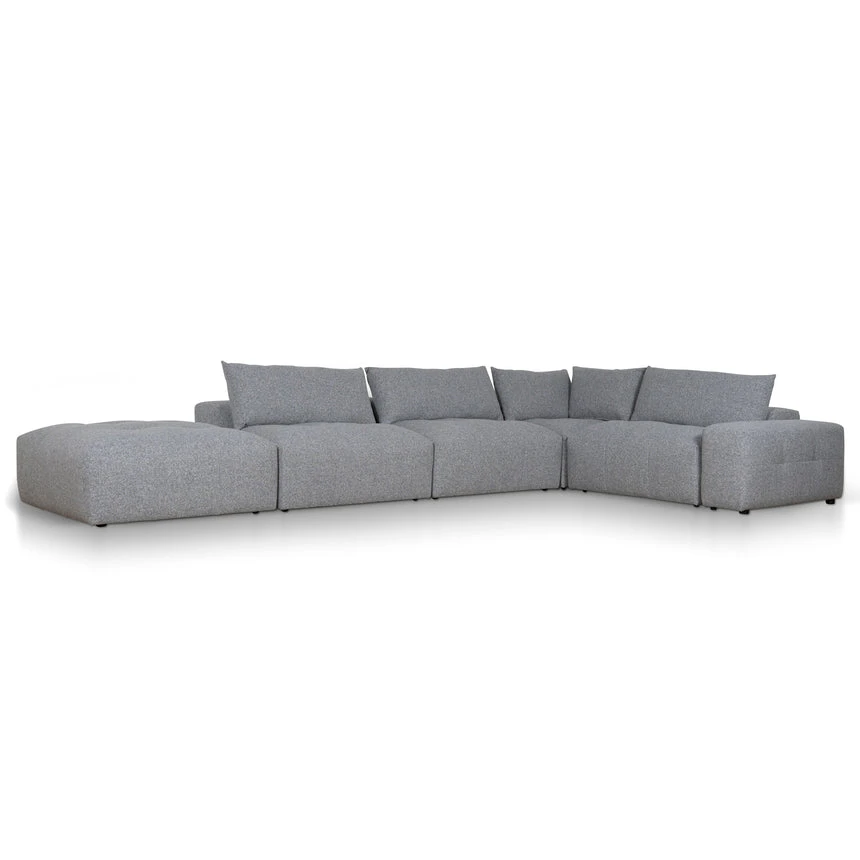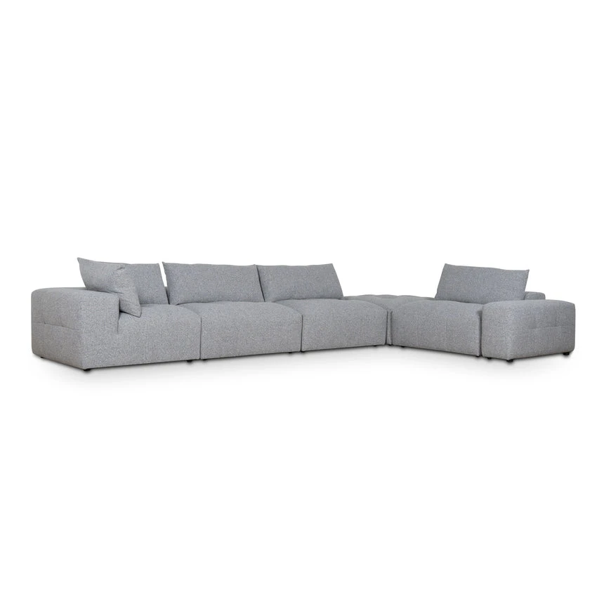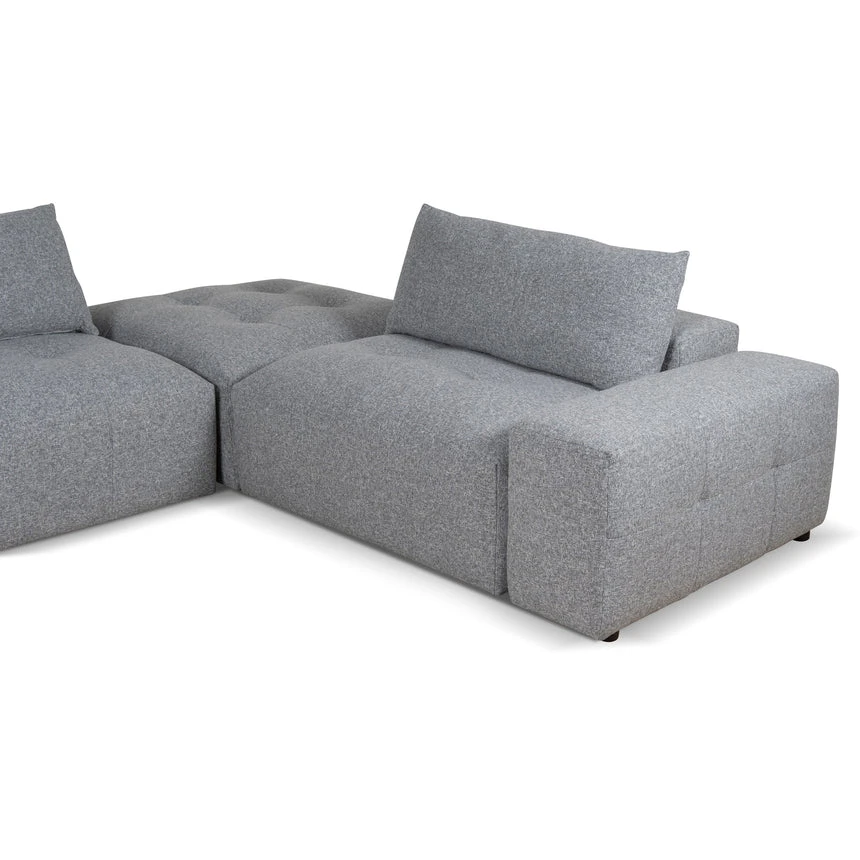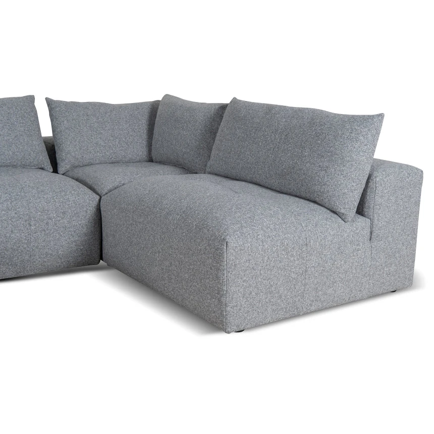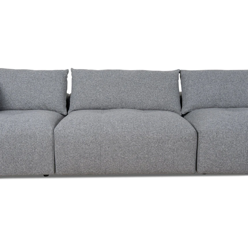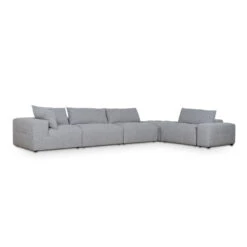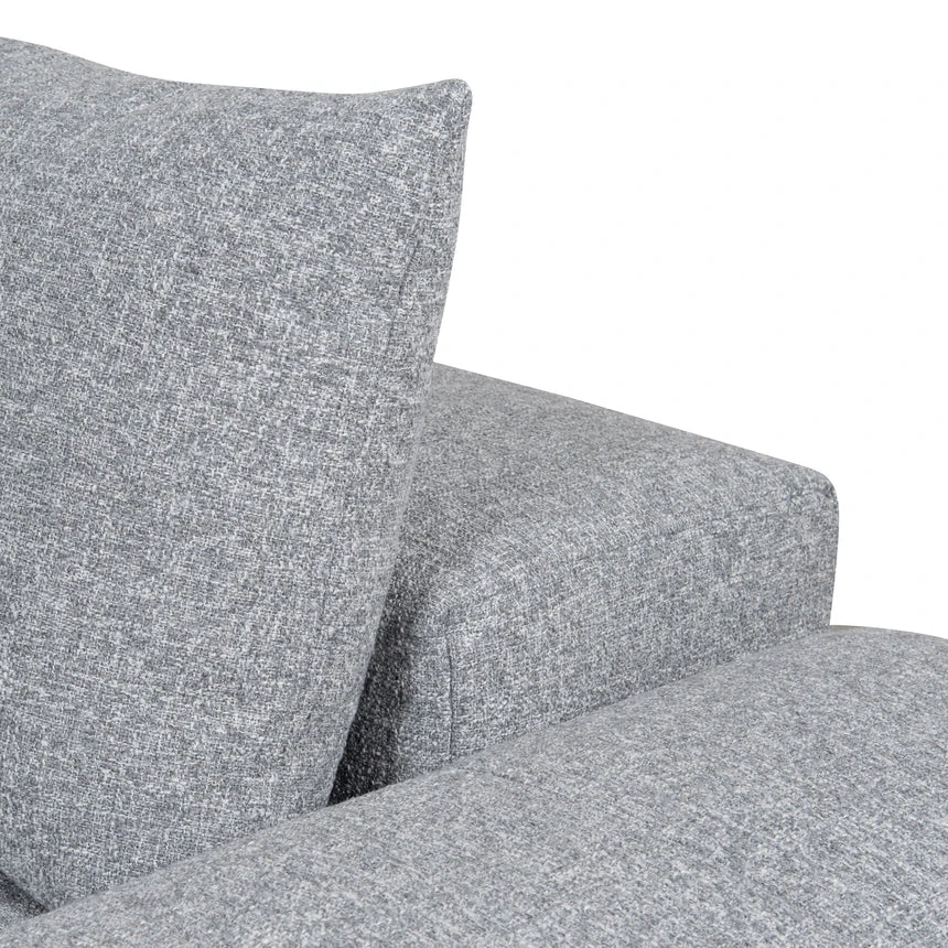 Glacier grey polyester upholstery Plywood and solid wood frame construction Foam, fiber, and feather blend cushion Web and spring suspension Large loose back pillow cushions Wide sleek armrests Sturdy rubber legs Soft seat firmness Easily rearrange the sections to fit your space Weight Capacity: 600 kg Product comes fully assembled