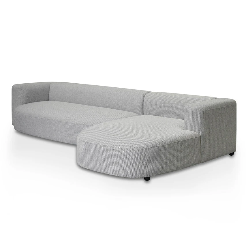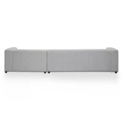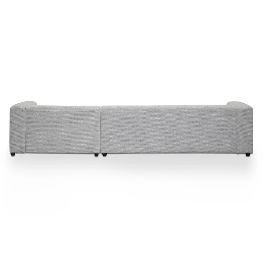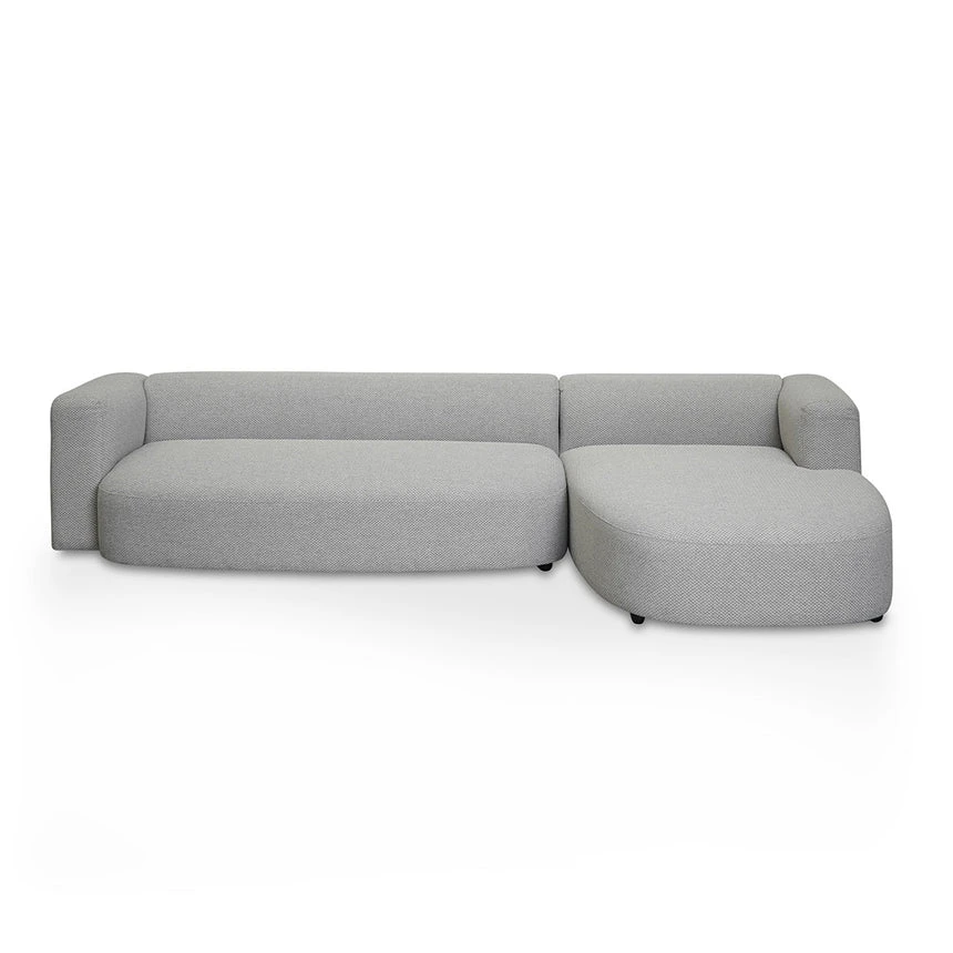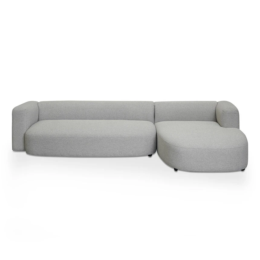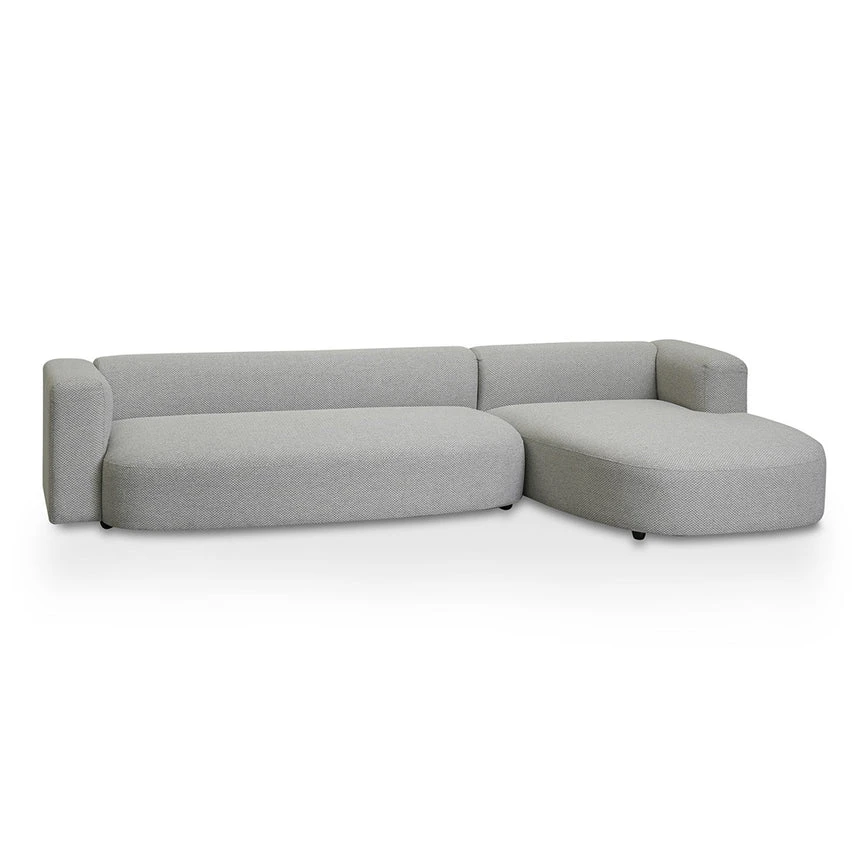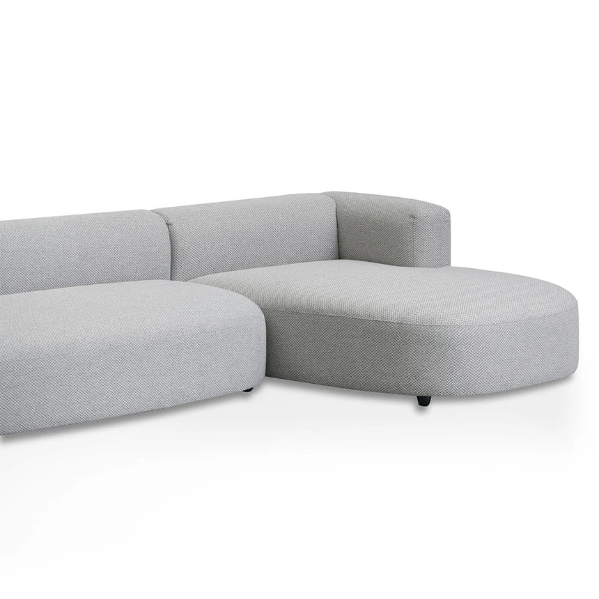 100% Polyester upholstery in grey finish Sturdy Pine wood frame Pine wood legs equipped with floor protectors Plane tight back and tight seat ideal for 3 people Right chaise formation with square arms Foam filling with web-spring suspension Product has soft-medium seat firmness Suitable for commercial use 500kg weight capacity Melbourne pick-up and delivery only