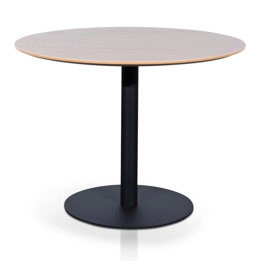 Table top in engineered wood construction Solid base in powder black metal Round table top with natural wood grain textures Product is flat packed and requires approximate duration of 20 minutes for one-man assembly