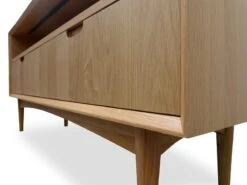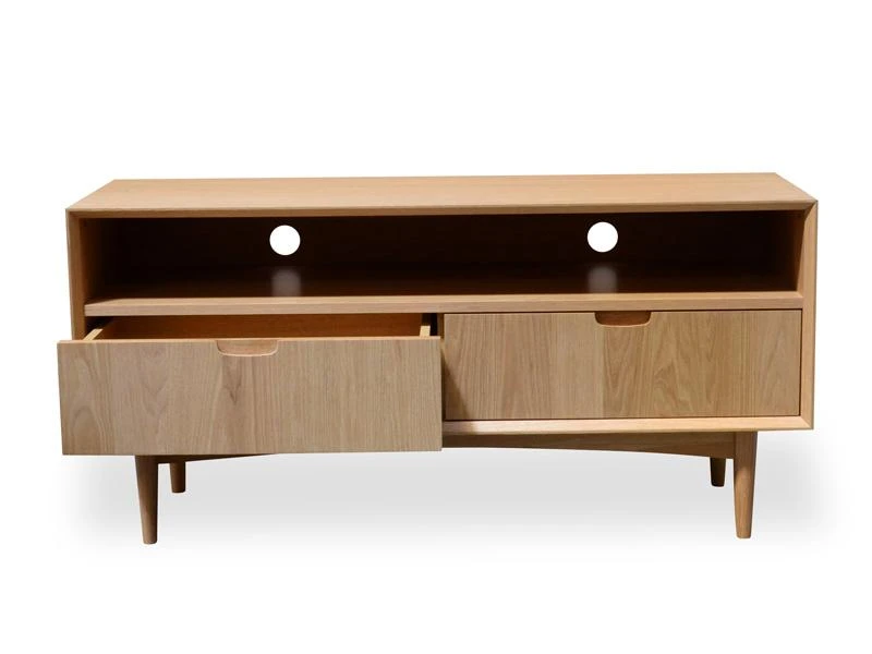 Solid oak wood legs Timber veneer body Features an open shelf and two large drawers 2x appliance holes for easy cable management Minor assembly required
