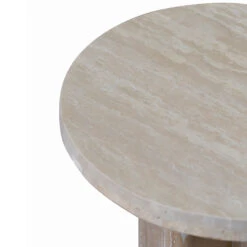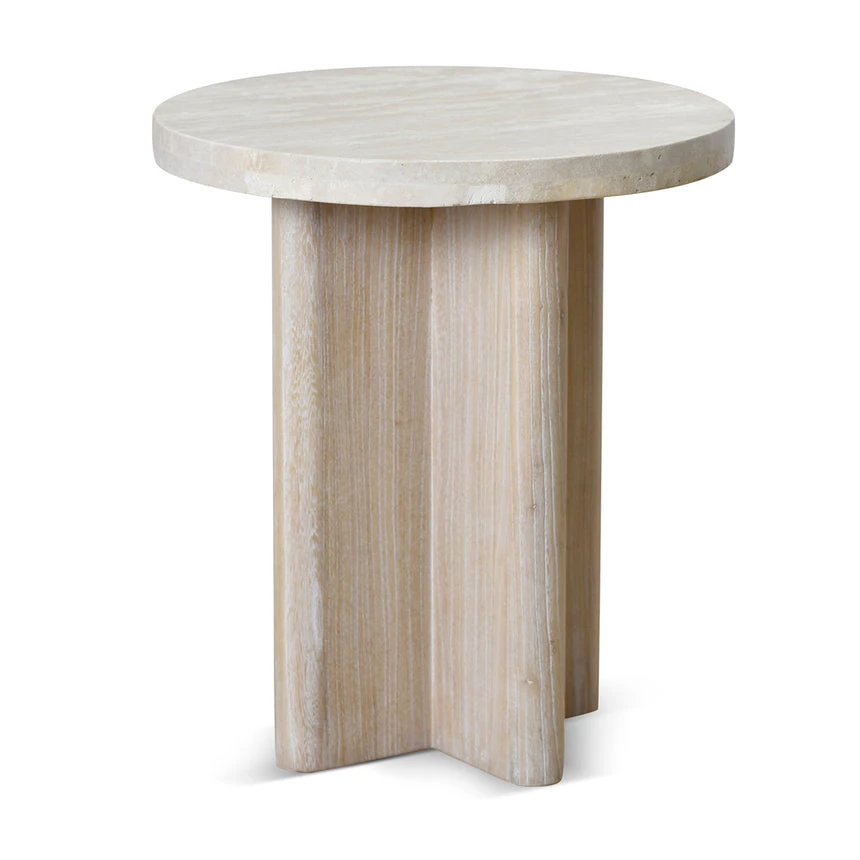 Travertine marble tabletop Elm base with veneer Circular top design Cross-legged style Visible wood grain on legs Weight Capacity: 40 kg Minor assembly required Note: Melbourne Pick-up and Delivery Only Travertine marble is a natural stone which will have unique imperfections and characteristics Any variations in colour, texture, polish and patterns are not faults Travertine marble is porous; wipe away any liquid spills immediately using water or a mild cleaner to avoid marks. Placemats and coasters are recommended Differences between shipments is to be expected
