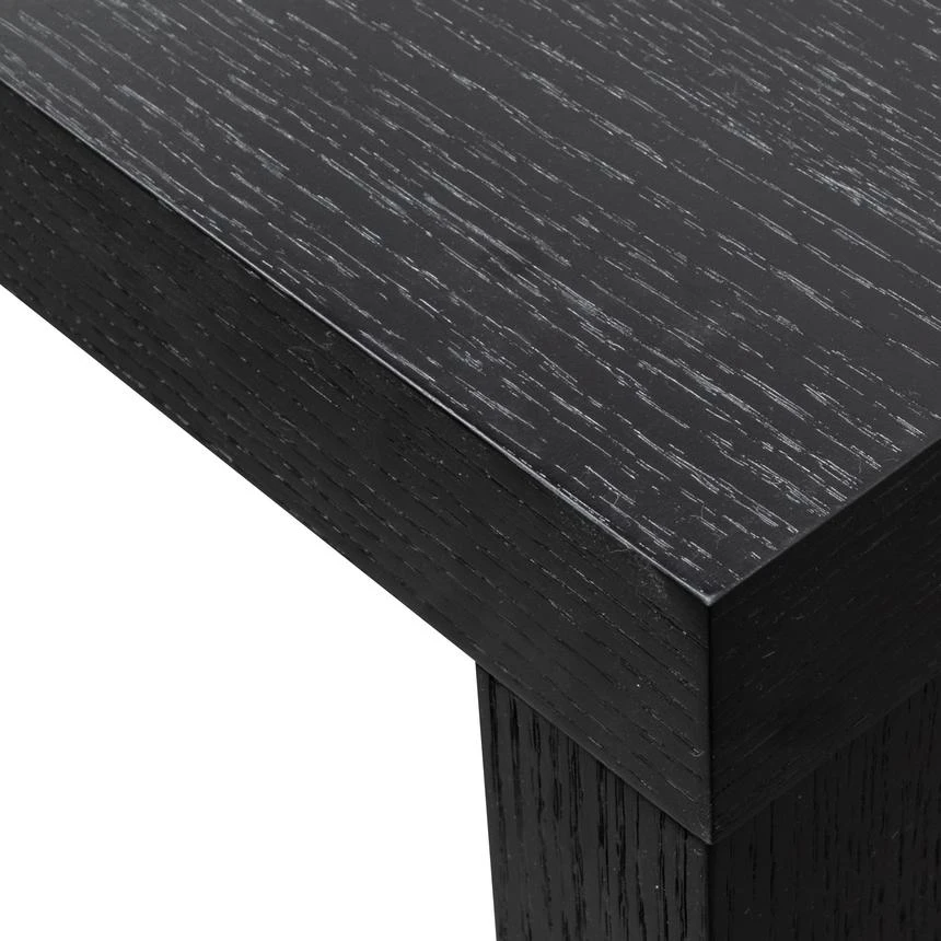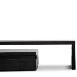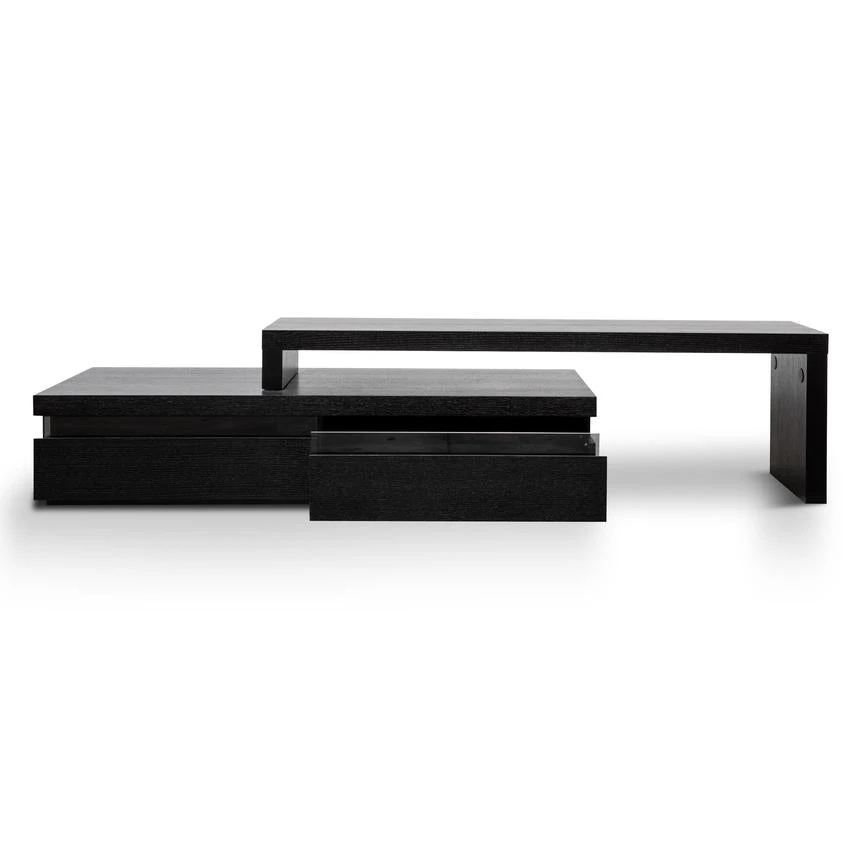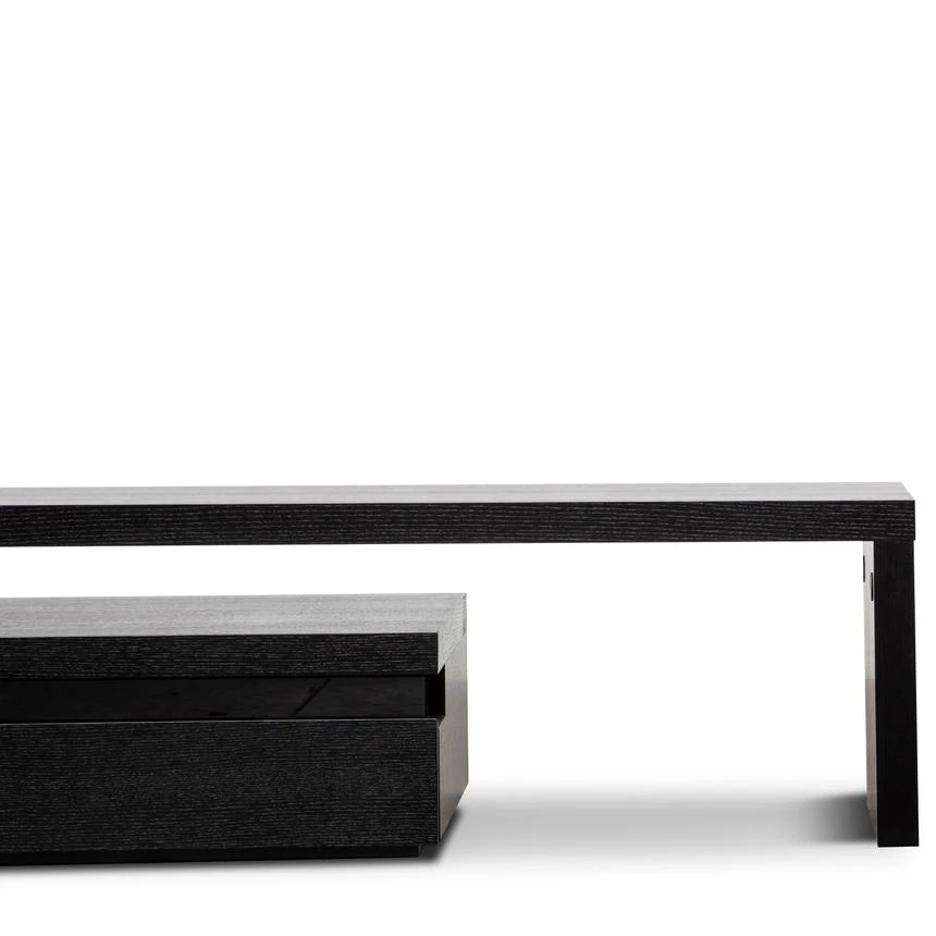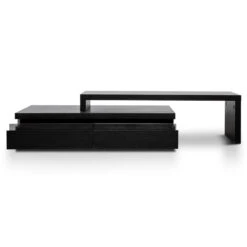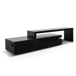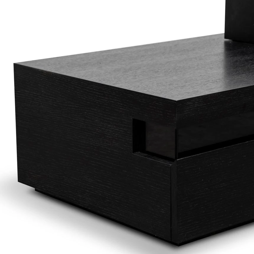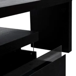 MDF construction in a matte black finish Solid on-ground base Handless drawers on metal rails with a glass feature 1 x top shelf and 2 x pull out drawers Minor assembly required