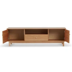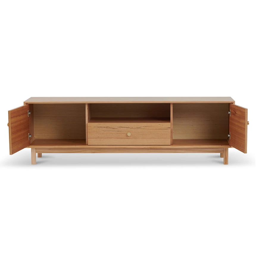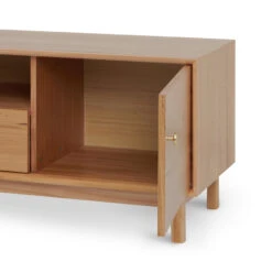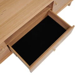 Top, sides & drawers/doors are made of engineered wood Finished in veneer which expresses the wood texture Legs and front frame are made of solid Messmate Legs are equipped with floor protectors 1× middle drawer with slides for smooth pull-opening 2× side cabinets and a drawer-top shelf for storage Round brass knobs on the drawer and cabinet doors Weight Capacity: 110 kg Product is fully assembled