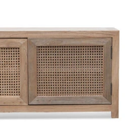 Reclaimed elm and wood veneer construction Doors in a PE rattan and wood build Exposed metal hinges and door knobs in a dark finish Complete natural finish Wide and generous size offering ample space for easy organisation and storage 4x push-to-open doors and concealed shelves Available for commercial use Product comes fully assembled Product care: Dust using a soft and dry cloth. Wipe up spills immediately. Wash with mild dish soap and water solution.