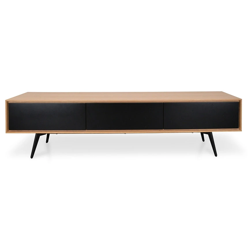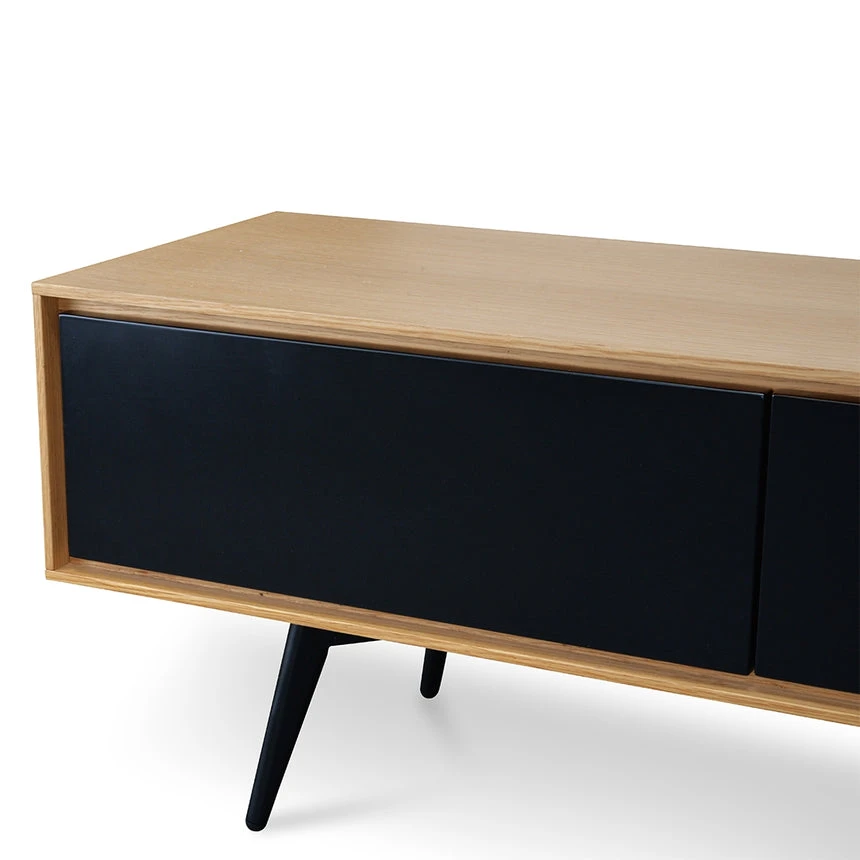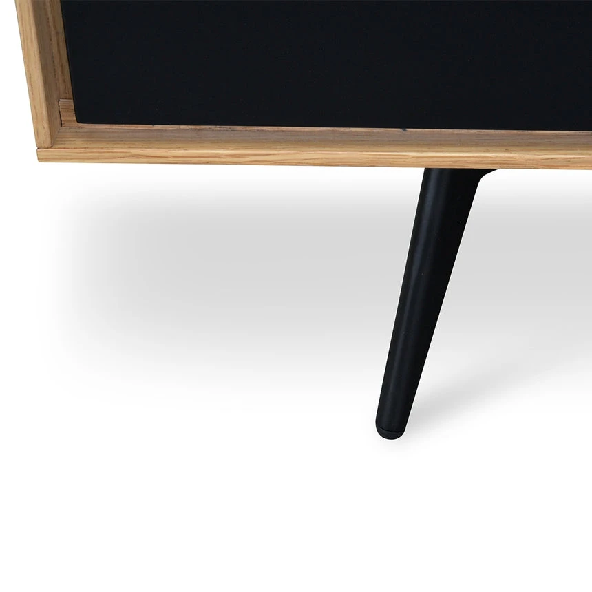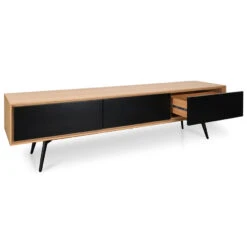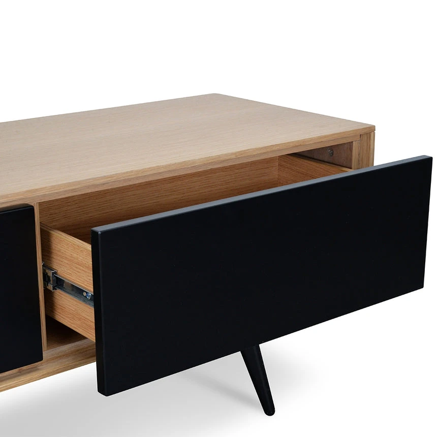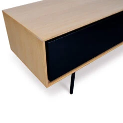Two black MDF push-out drawers Centre fold down door compartment MDF body with natural oak veneer outside for a contemporary finish Drawers made from MDF with a black matte finish add a sleek look Strong and stable black matte metal legs Raised and flared legs bring a light look to the design