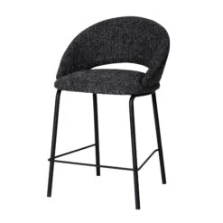 Pale beige polyester upholstery Timber and iron frame construction White powder-coated metal legs Foam filling Soft-medium seat firmness Ergonomic curved backrest Open-back design Integrated footrest Weight Capacity: 150 kg Minor Assembly Required