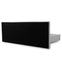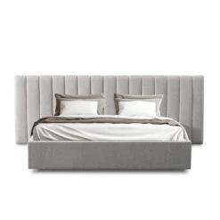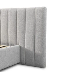 Clay Grey polyester upholstery Frame and body constructed from timber Strong hardwood frame and metal slats frame Bed frame supported by recessed black steel legs The recessed legs give the illusion that the bed is floating Wide and extended bed head Vertical panelled detailing on headboard Concealed gas lift storage Accommodates a standard queen size mattress Product is flat packed and requires two-man assembly, bed slat comes pre-assembled Note: Bed mattress not included