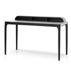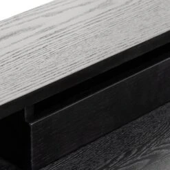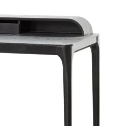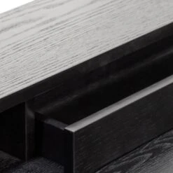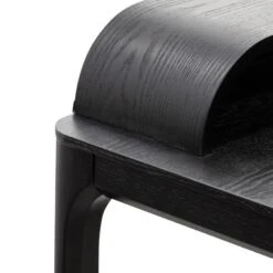 Table top in engineered wood with black ash veneer finish Tapered legs with curved upper structure and detailing in solid ash construction In-built storage compartment with 1x removable drawer Natural exterior promotes visibility of craftsmanship and deep wood textures Product is flat packed and requires two-man assembly