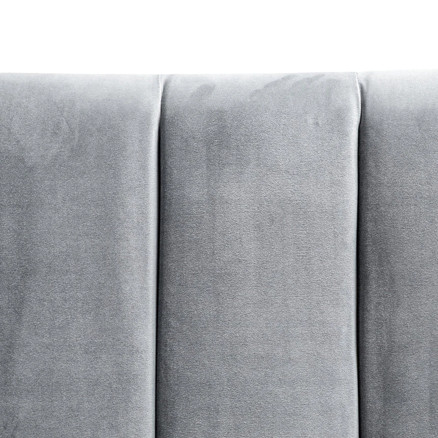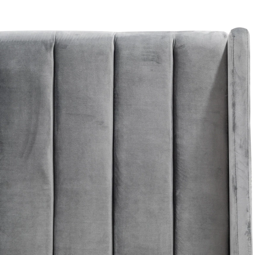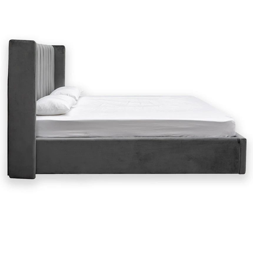 Entire frame and bed head upholstered in charcoal velvet Vertical linear seam pattern on bed head Hardwood frame and slats are included Bed frame supported by recessed black steel legs The recessed legs give the illusion that the bed is floating Accomodates a standard queen