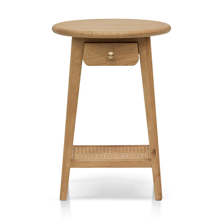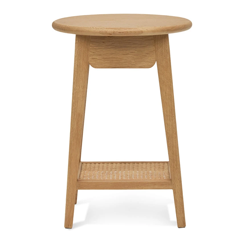Solid heartwood oak body 1× drawer under the circular table top 4× square tapered legs with feet protectors Brass brushed drawer knob Rattan woven lower shelf Weight limit: 100kg Product is fully assembled