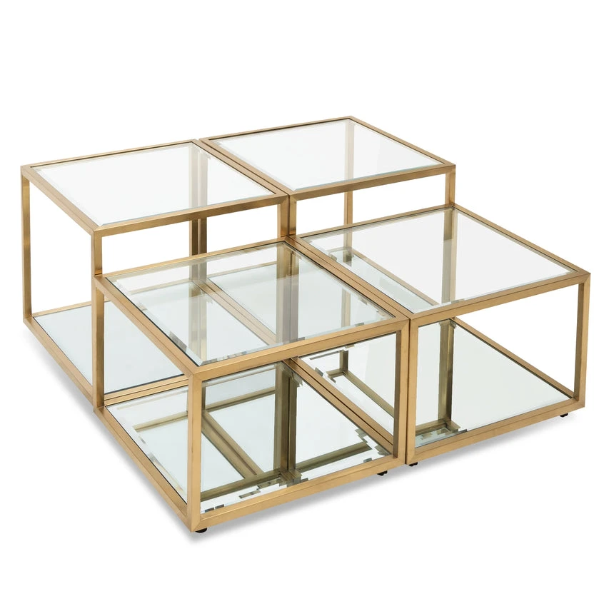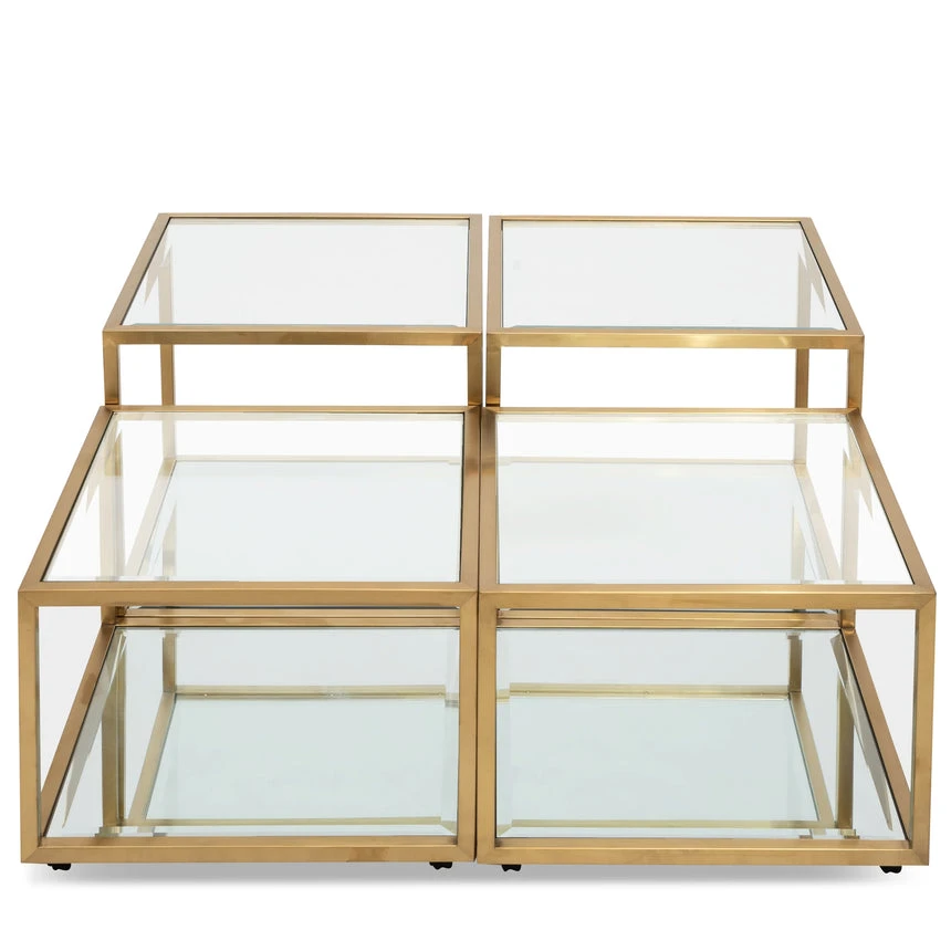 Features 4x coffee tables at 2 varying heights Each table features a squared clear tempered glass table tops and a mirrored lower surface Table tops have slightly bevelled edges Strong metal legs and frame in a brushed gold finish Simple silhouette elevated by the clear and metallic textures Feet protectors included to prevent slipping and scuffing Note: Product requires two-person handling