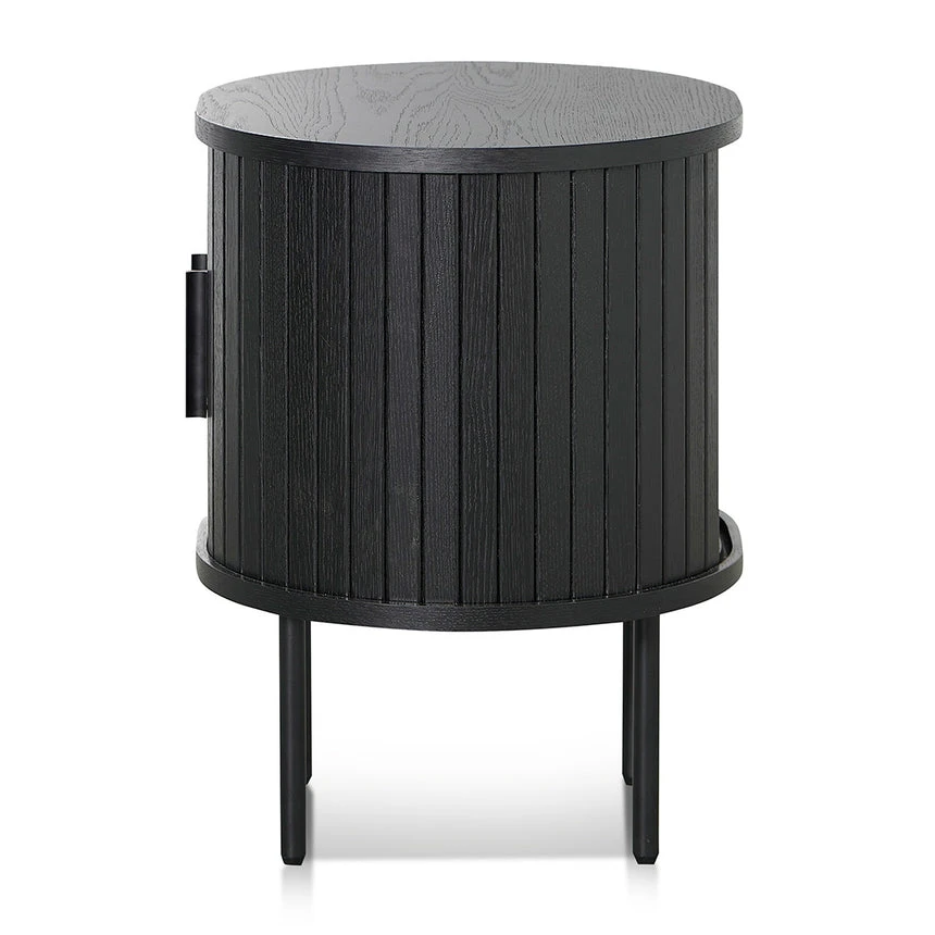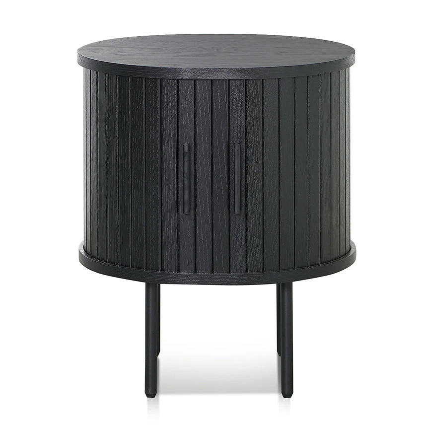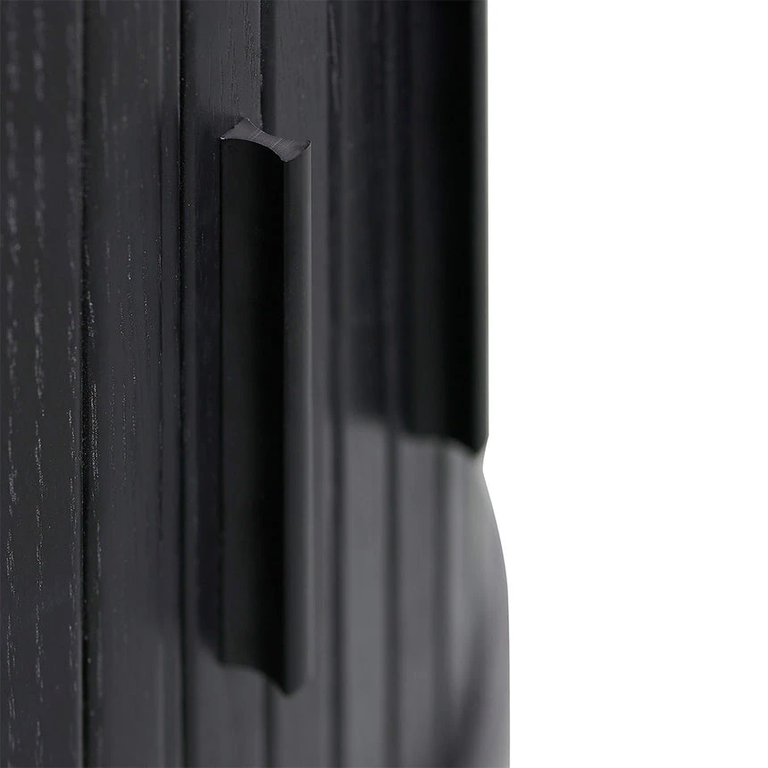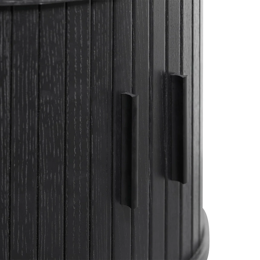 MDF construction in a black oak veneer finish Black powder coated metal legs One adjustable shelf Sliding doors with matte black handle Weight Capacity: 80 kg Product comes flat packed and requires two-person assembly and a screwdriver
