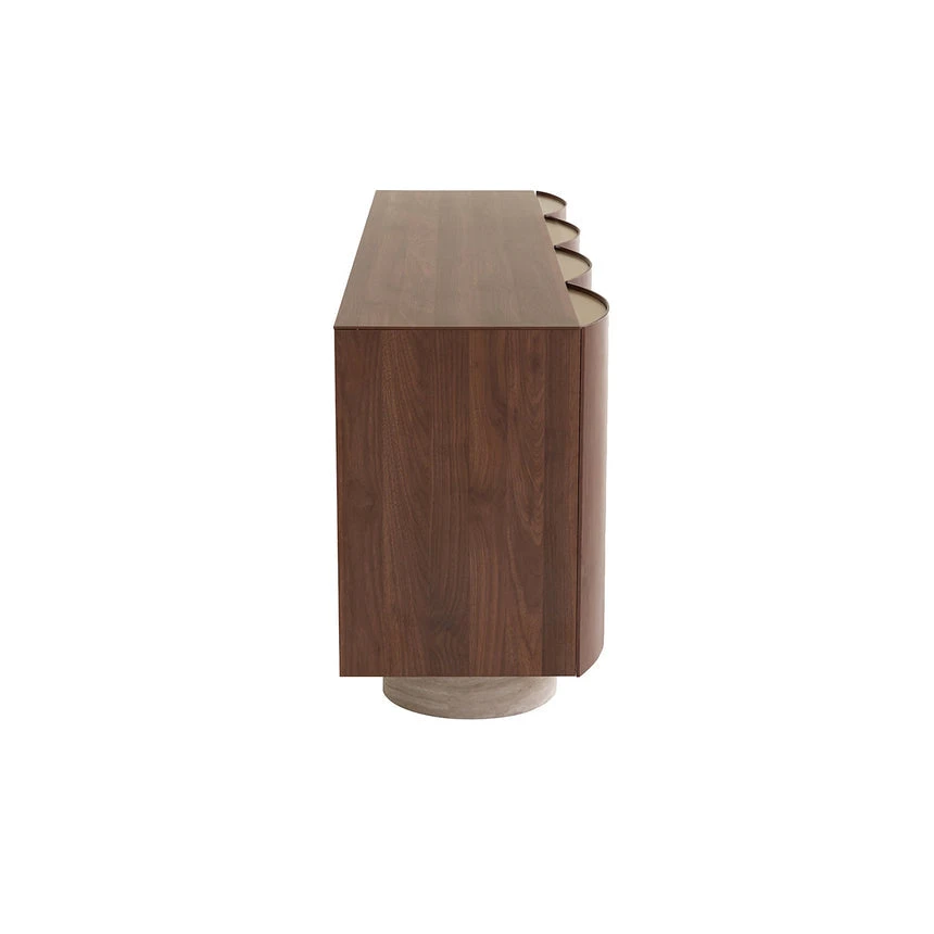 Textured travertine look base Engineered wood body with melamine body Engineered wood with natural walnut veneer doors Walnut PU coating Rich tones and natural grain patterns Contemporary curved edges Two cylindrical base Multiple cabinets with interior shelving Curved front panels Weight Capacity: 100 kg This product is supplied flat-packed and requires assembly by two people