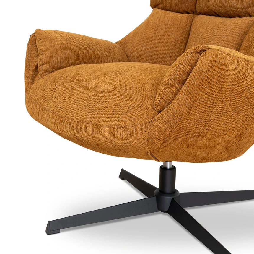 Honey yellow polyester upholstery Iron frame and legs Foam filling Soft-medium seat firmness Tufted cushioning 360° swivel base Weight Capacity: 200 kg Product comes flat packed and requires a two-person assembly