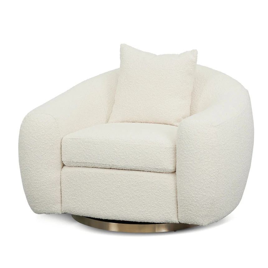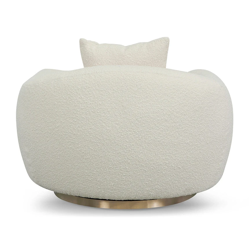 Upholstered in white boucle fabric 54% polyester and 46% acrylic Made of pinewood timber Stainless steel base with gold finish Foam with web suspension Medium-soft firmness Rounded contour design Weight capacity: 130 kg Product comes fully assembled