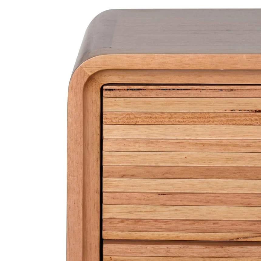 Messmate wood construction Natural and powder black finish with deep wood grains throughout Includes wood slat design on cupboard drawers Square wooden legs for subtle height suspension Features 5x drawers on metal rails Product is fully assembled