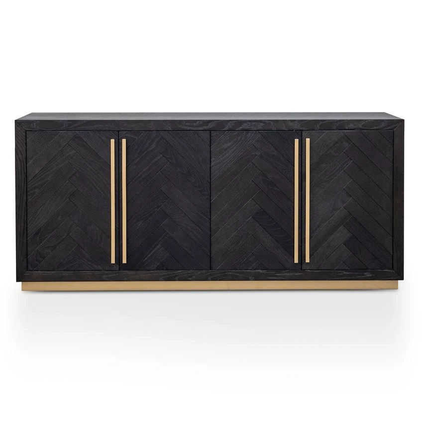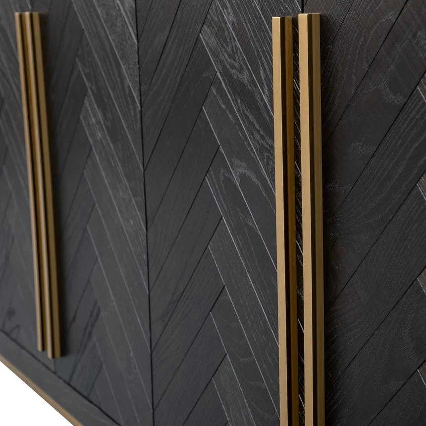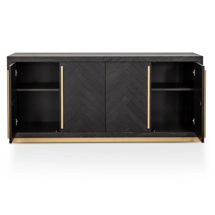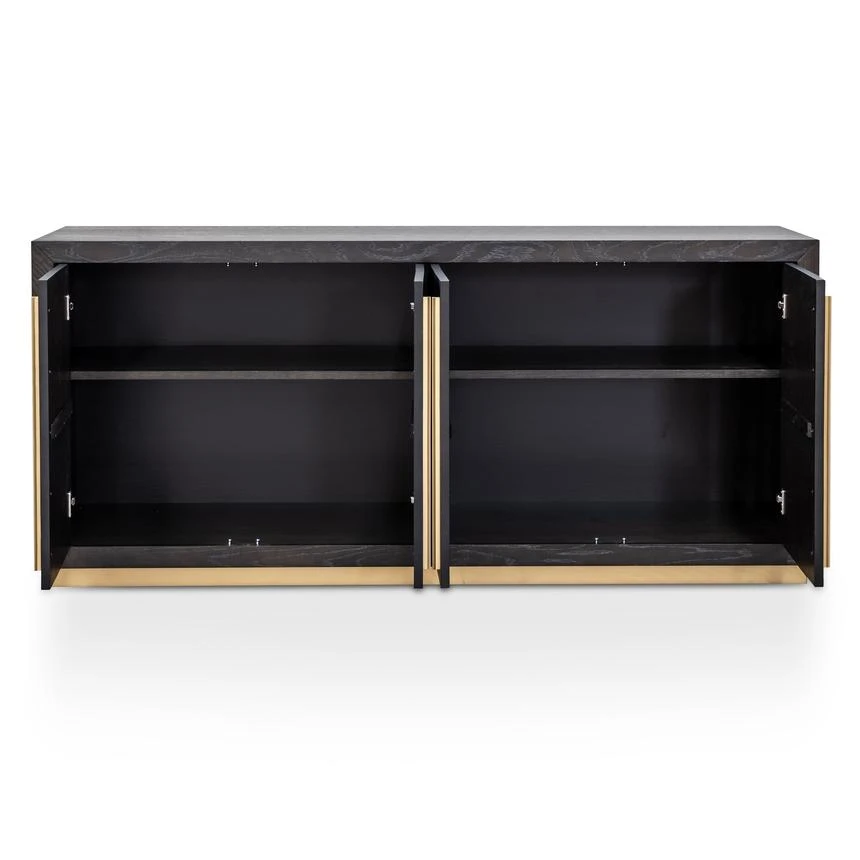 Black wood veneer finish Unpolished brass base and handles Four cabinet doors One removable shelf on each side Fully assembled